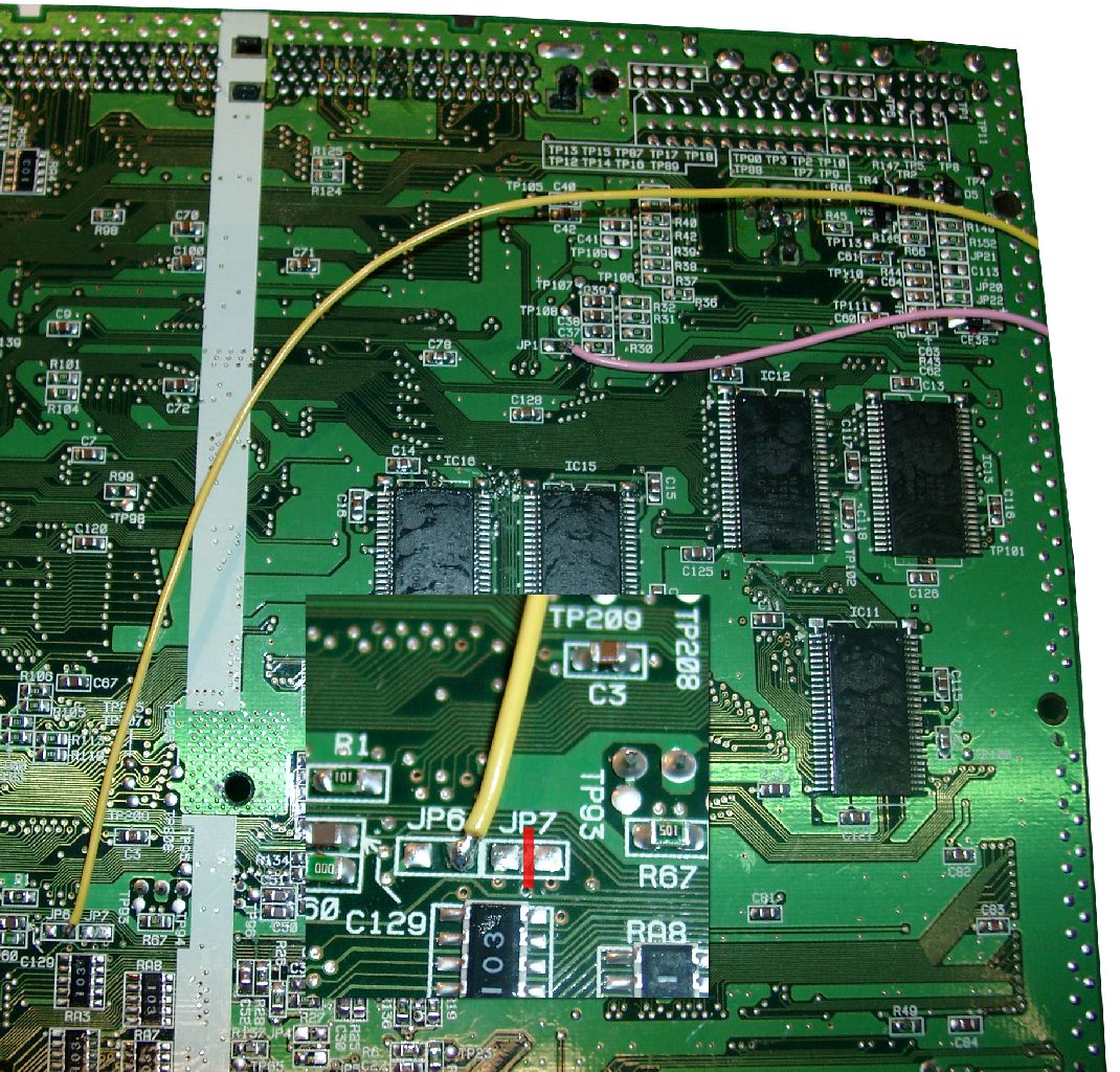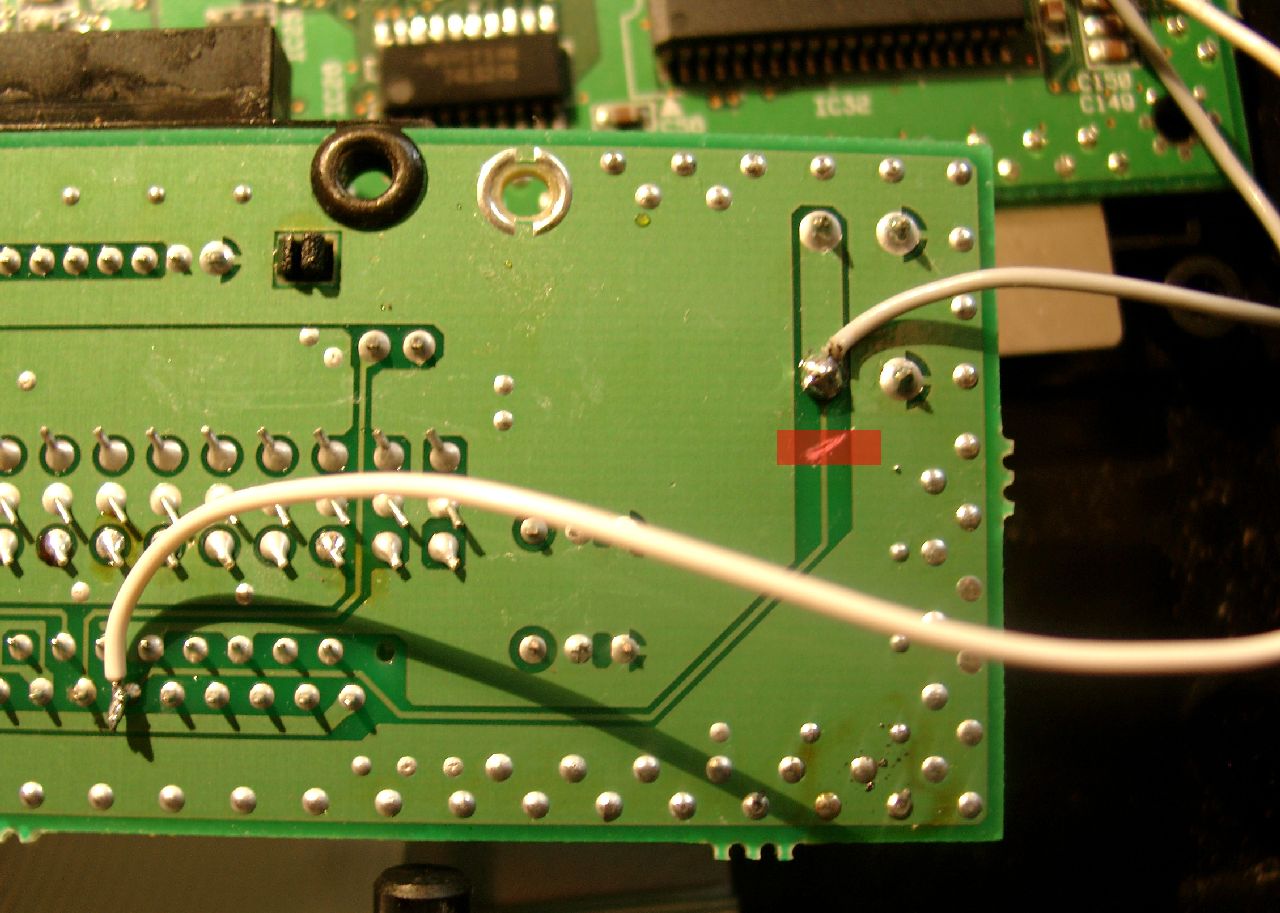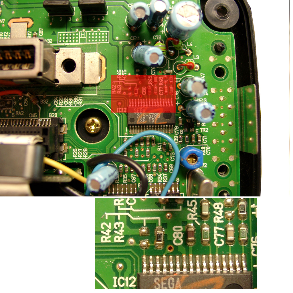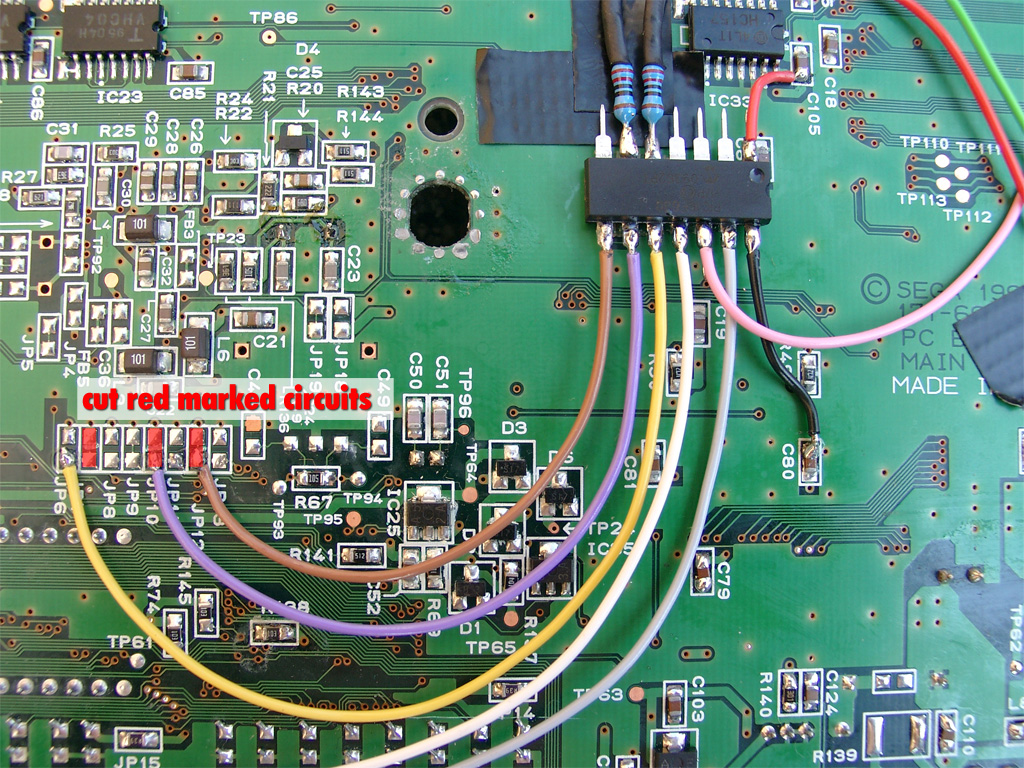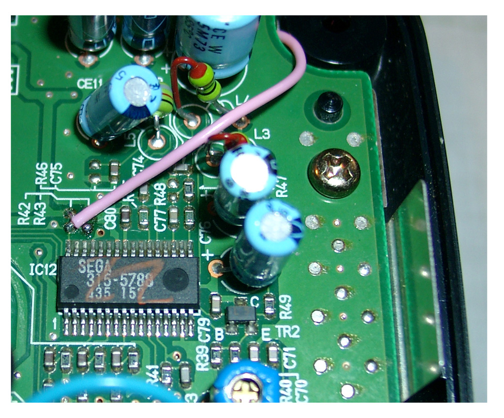 Solder one pink wire from AV Out Pin 6 (solder Site) to Pin 32 of IC12 (component site)
