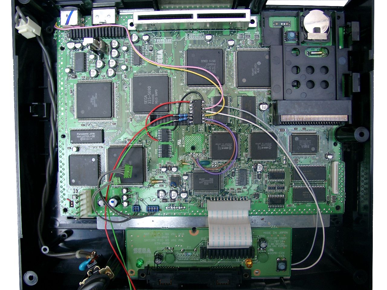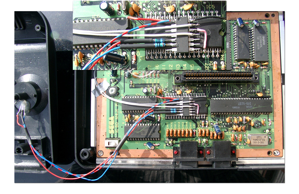 For Sega CD support you have to cut Pin A01 (yellow wire) and Pin A30 (blue wire) of the Genesis Expansionsport and solder the 2 wires to the PIC Pin 10 blue and PIC Pin 8 yellow.