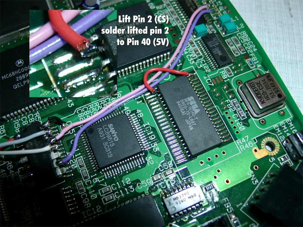First you have to disable to onboard bios. Desolder PIN 2 (CS) of the onboard ROM and lift the pin up. Solder a red wire from the lifted Pin 2 of the ROM to Pin 40 (5V) of the ROM.