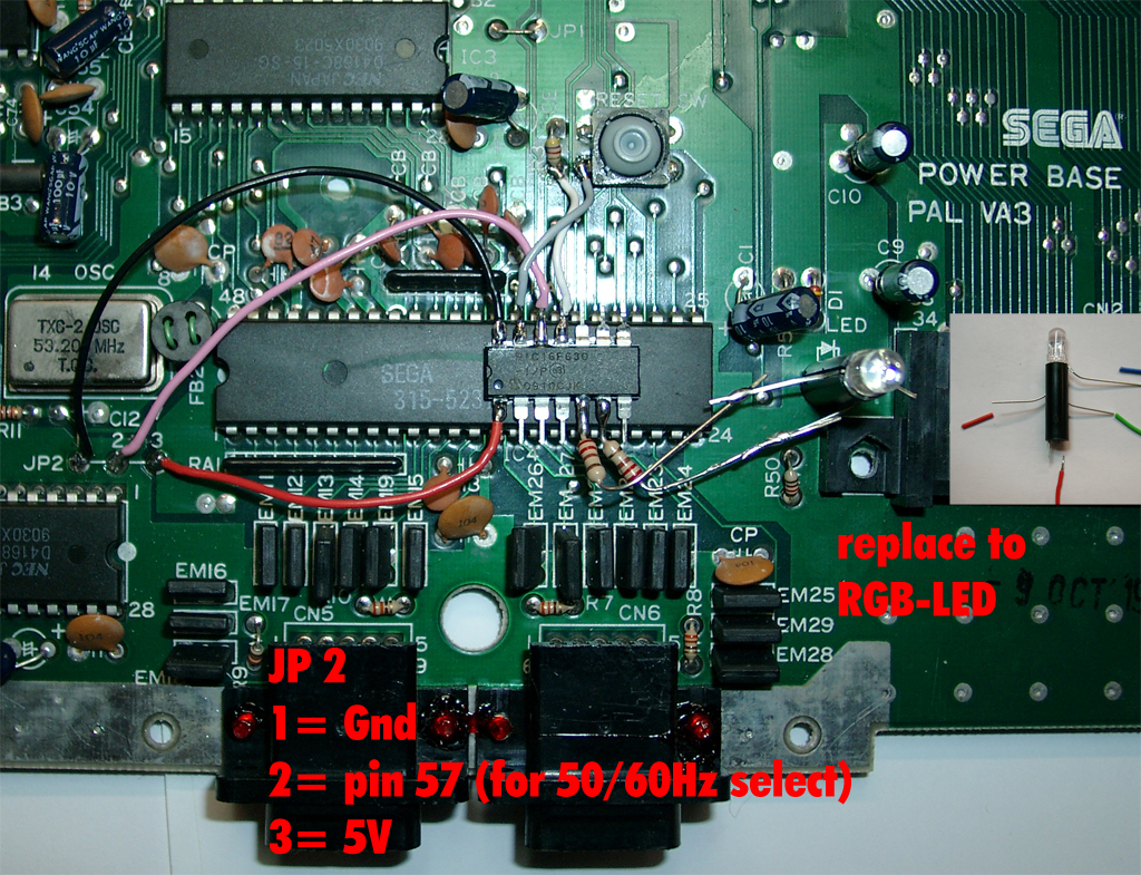 Pin 46 at Sega 315-5560 -> 50/60Hz switching. GND= 50Hz and 5V = 60Hz (JP3, JP4)