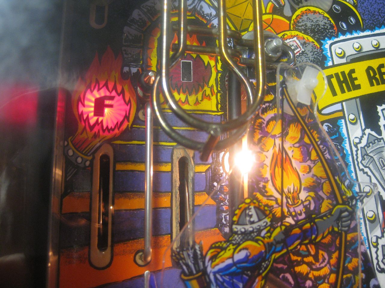 I used a 2,5mm Drill and 3mm LEDs in green for the eye replacement. The installation is done solderless with the „croco“ connectors to the 28 bear playfield flasher with two 680 Ohm Resistors.