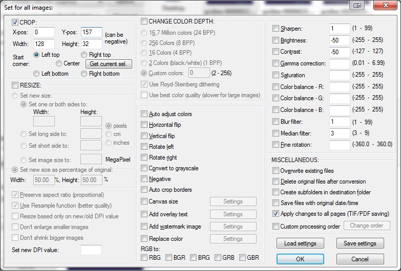 Under File: Batch conversion (set to PNG Output Format) and press Advanced Button: Here you can set the X-pos, Y-pos Position