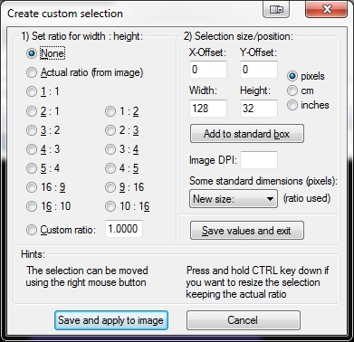 With the help of irfanview (a pictureviewer) you can create a custom selection (under edit) with Width: 128 and Height: 32.