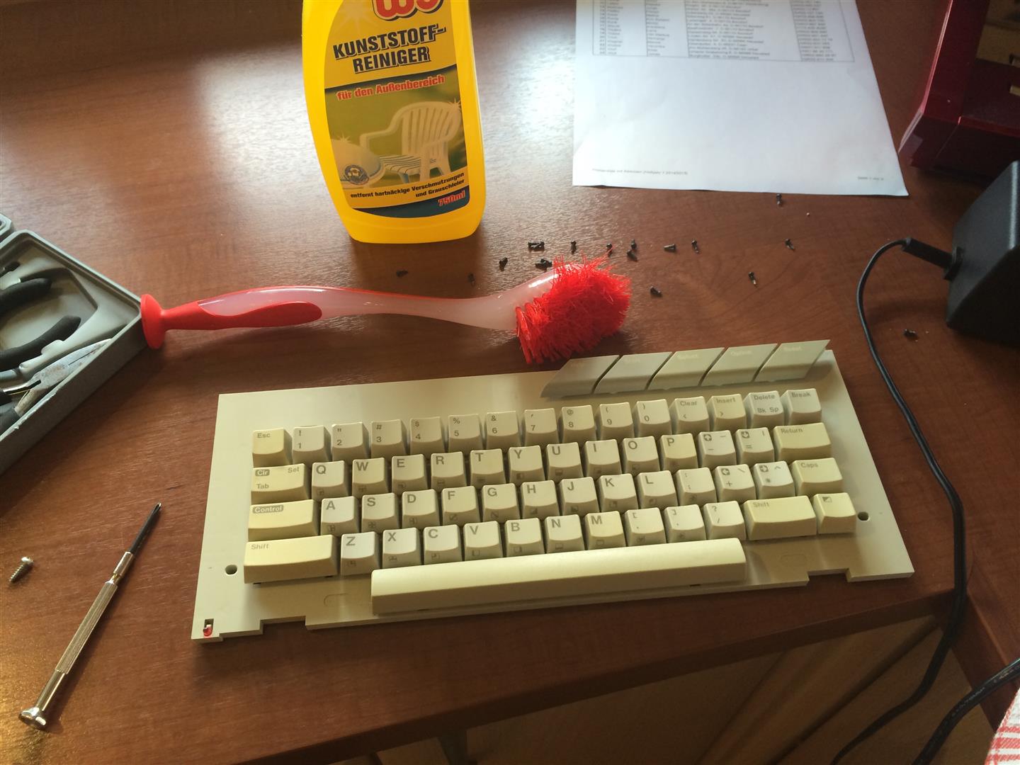 For cleaning the keyboard I used plastic cleaner with a brush and removed the water with a pressure air compressor.