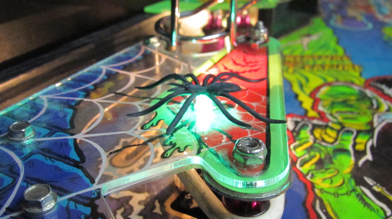 I used some plastic spiders and put them to a plastic. Under the spider I put a green 5 mm Led to make it more effectfull.You will get three spiders